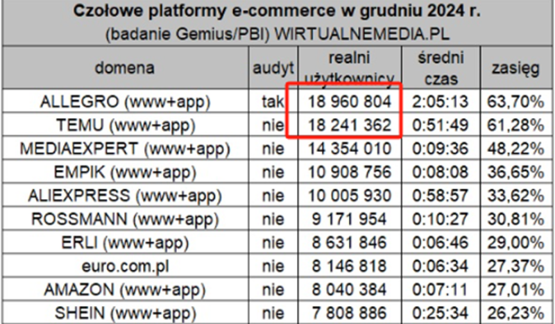 就在上个月,波兰跨媒体研究公司Mediapanel发布一项关于2024年12月波兰电商平台的研究报告,其中指出,Temu正以惊人的增长速度向波兰最大霸主Allegro逼近,二者月均访客量差距已经缩小至72万。