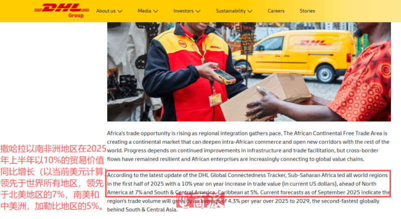 根据前两日DHL新发布的《DHL全球连通性追踪简报》数据显示,撒哈拉以南非洲地区在2025年上半年,以10%的贸易价值同比增长(以当前美元计算)领先于世界所有地区,高于北美地区的7%,南美和中美洲,加勒比地区的5%。