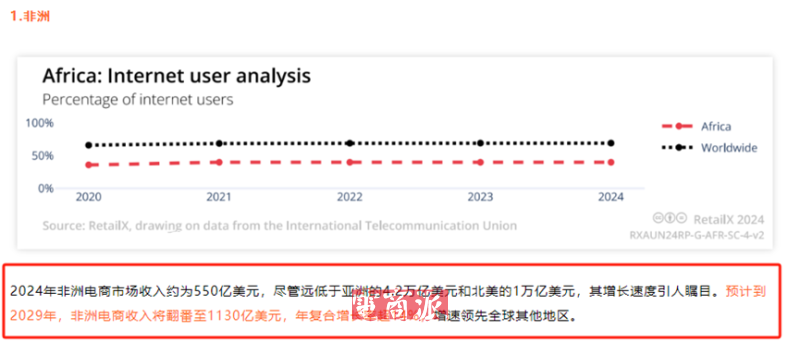 在电商收入上虽不及亚洲、北美等热门地区,但增速表现十分亮眼。据RetailX此前发布的2024年全球市场报告指出,2024年非洲电商收入达到约550亿美元,预计到2029年这一数值将暴涨至1130亿美元,年复合增长率超14%。