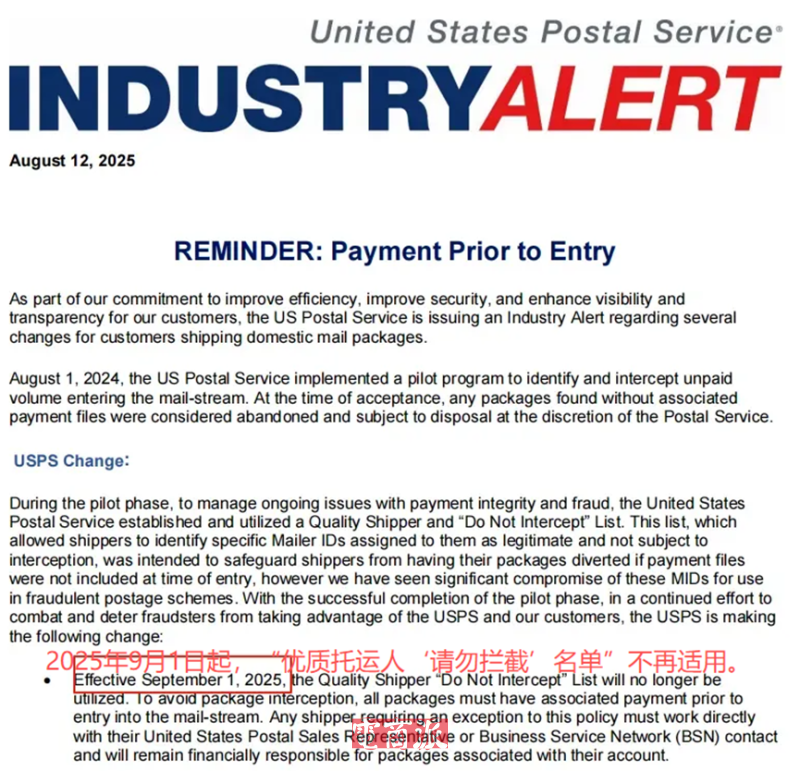 此外,自9月1日起,美国邮政还推出了一系列新规打击邮资欺诈行为,包括停用“优质托运商‘请勿拦截’清单”、启动“追踪号码唯一性管控”策略、遗弃处理进入快递流的未支付包裹等。