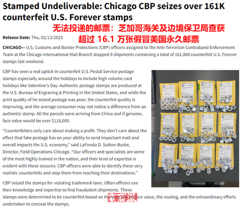 今年年初,美国海关和边境保护局(CBP)就一举拦截了16万张跑水面单。具体来说,该部门在芝加哥国际邮政分局发现了8批使用假冒美国邮政永久邮票的跨境货物,查获假冒邮票共计161860张,如果这些邮票为真品,涉案金额将超11.8万美元。