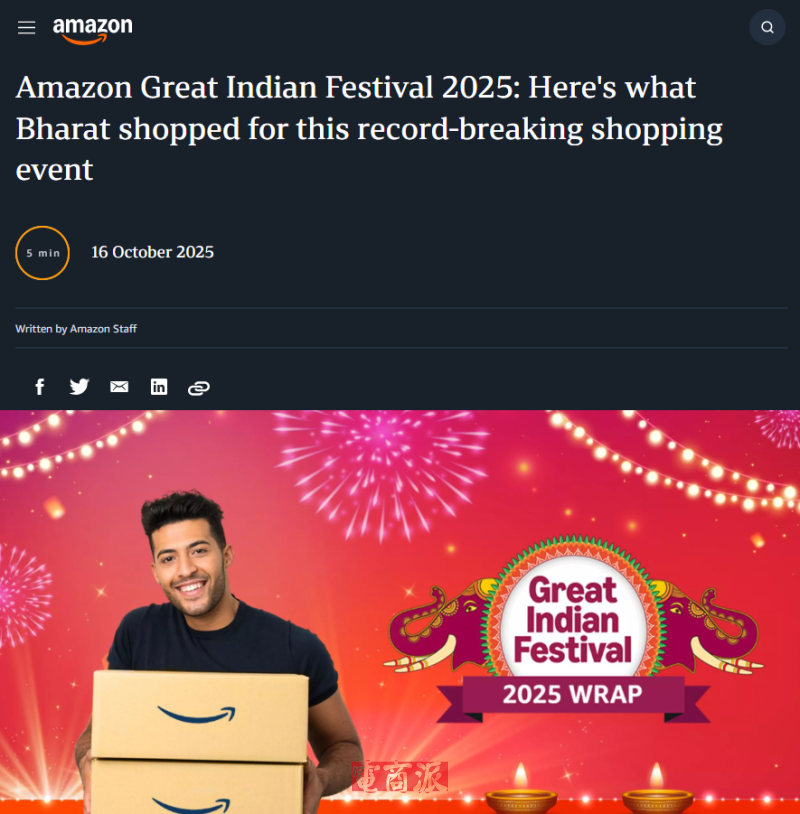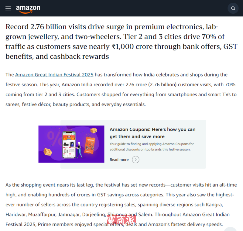 10月21日消息,2025年亚马逊印度购物节(Amazon Great Indian Festival 2025)创下多项纪录,平台访问量超过27.6亿次,其中70%来自二三线城市。消费者购买的商品涵盖智能手机、智能电视、纱丽、节日装饰、美妆产品及日常用品等多个品类。通过银行优惠、GST减免及返现奖励,用户共节省约1000亿卢比。