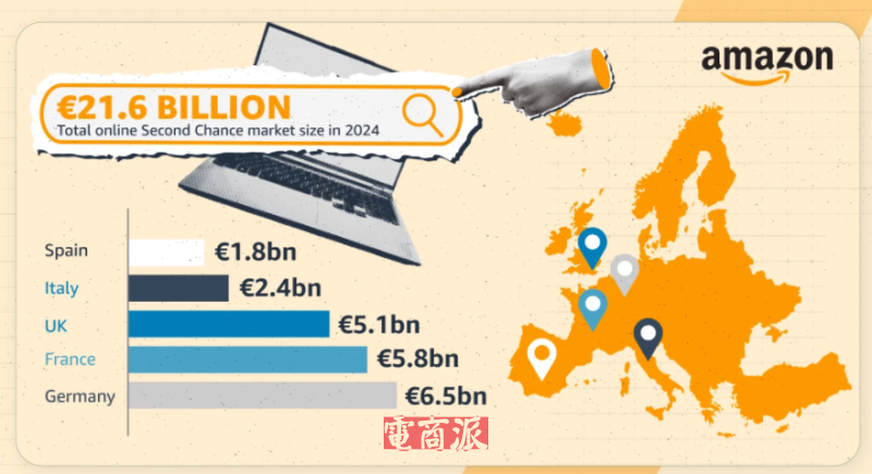 以欧洲为例,亚马逊官方发布的数据显示,欧洲地区的二手电商市场规模已达216亿欧元,并且有超三分之二消费者购买过二手商品。光是在2024年,欧洲二手市场上流通的产品就已经超过了7.4亿件,未来还有进一步增长的趋势。