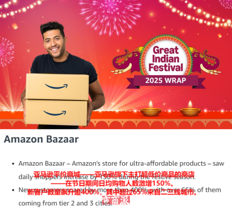 据亚马逊统计,今年亚马逊印度“大印度节购物节”(Amazon Great Indian Festival 2025)期间,亚马逊低价商品专区Amazon Bazaar新客数量暴涨400%,日均下单人数增长150%。卖家数量同比增长两倍,超过半数卖家创下单日最高销售纪录,期间销售额突破10万卢比的卖家数量同比增长15倍。