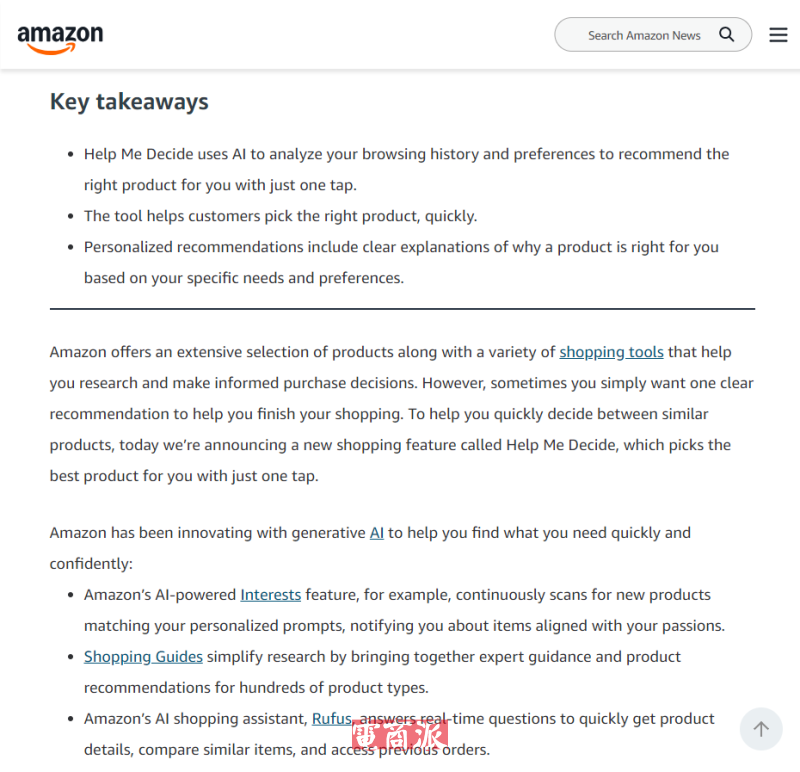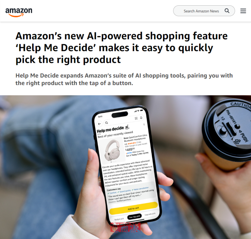 Help Me Decide依托亚马逊自研的生成式AI大模型及AWS旗下的多项云端AI服务,包括Amazon Bedrock、Amazon OpenSearch和Amazon SageMaker,用于理解用户需求与偏好,并结合商品数据及用户评论生成推荐结果。亚马逊表示,该功能可节省购物时间,通过AI为用户提供精准的个性化推荐,增强购买信心,并进一步优化整体购物体验。