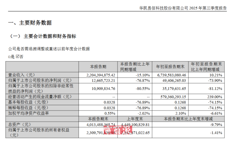 华凯易佰财报数据显示,2025年前三季度,公司实现营业总收入67.40亿元,同比增长10.21%,归母净利润4940.63万元,同比下降73.90%,实现扣除非经常性损益后的归属于上市公司股东净利润3517.96万元,同比下降81.12%。