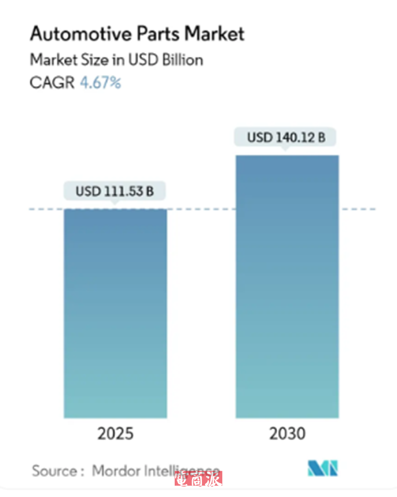 Mordor Intelligence数据显示,2025年,全球汽车零部件市场规模将达到1115.3亿美元,预计到2030年将攀升至1401.2亿美元,复合年增长率为4.67%。