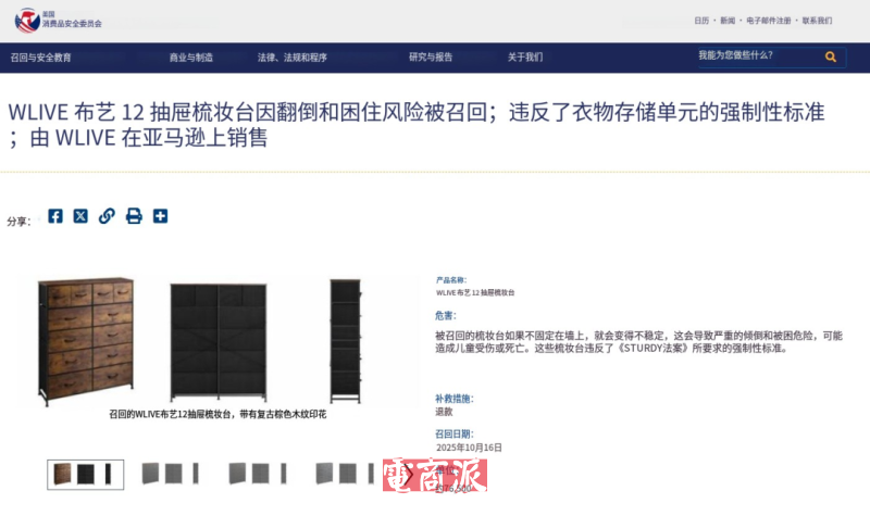 近期,美国消费品安全委员会(CPSC)宣布召回江苏常州品牌WLIVE旗下的12抽屉布艺梳妆台,召回编号为26-022。