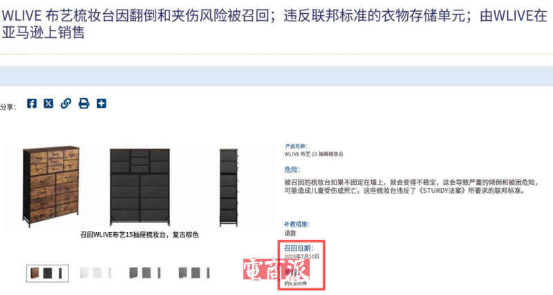需要注意的是,这并非WLIVE 首次陷入召回困境——今年7月,WLIVE旗下的15抽屉梳妆台也被要求召回了6600个,召回编号为25-380,处理结果同样是全额退款。