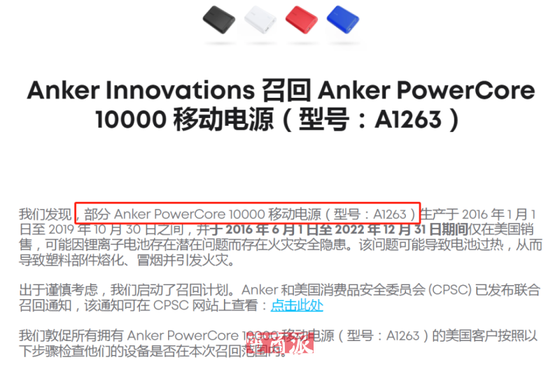 今年6月,安克创新宣布在美国启动 PowerCore 10000 移动电源(型号 A1263)的召回程序,原因是这批产品所搭载的锂离子电池可能存在缺陷,存在起火风险,并且销售时间跨度极长,从2016年6月一直延续至2022年12月。