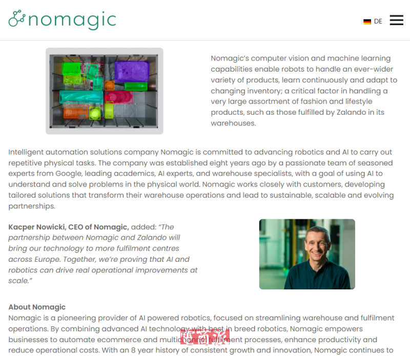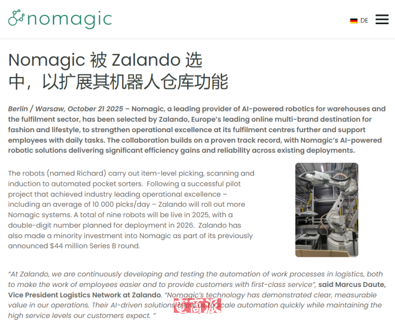根据计划,到2025年底,Zalando将部署9台Nomagic机器人,并在2026年实现双位数规模。同时,Zalando参与了Nomagic的B轮融资,以少数股权形式投资该公司,该轮融资总额达4400万美元。Zalando方面表示,此次战略合作旨在进一步提升履约中心的运营效率,并减轻员工日常重复性劳动负担。基于AI的Nomagic系统在先前测试中显著提升了生产力与系统稳定性。