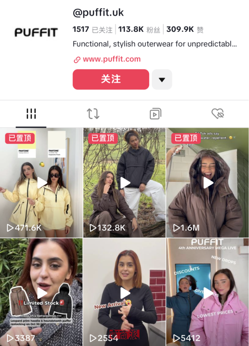 与此同时,品牌自营能力也实现大幅提升,其TikTok英区官号保持高度活跃,通过趋势挑战、真人出镜讲解、户外场景展示等内容推高产品曝光,触达更多潜在客户。截止目前,品牌官号@puffit.uk粉丝量已突破11万。