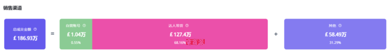 据三方平台数据,目前PUFFIT英国小店已实现销售额约186.93万英镑(约合人民币1771.21万元),其中自营渠道收入1.04万英镑,占比0.55%;达人带货渠道收入127.4万英镑,占比68.16%;其他渠道,如商城商品卡、店铺主页、橱窗等收入58.49万英镑,占比31.29%。