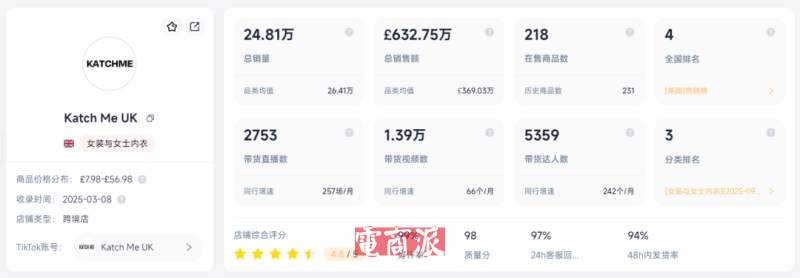 正是这种有的放矢的策略,支撑Katch Me持续叱咤市场。据三方平台数据,目前在TikTok Shop英国站,Katch Me依然稳居女装与女式内衣类目前三,累计销售额达632.75万英镑(约合人民币6001.26万元)。