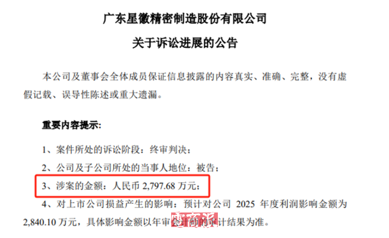 2025年,广东省深圳市中级人民法院又向星徽股份出具了《民事判决书》,判决结果显示,星徽股份子公司泽宝技术需要判决生效后十日内,向孙才金等人支付业绩奖励金及相应的利息损失,合计金额2797.68万元。