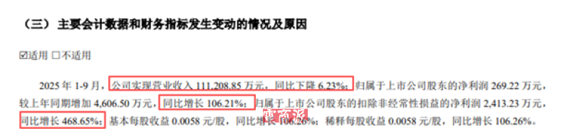 好消息是,更为关键的利润数据出现大幅上扬。前三季度归属于上市公司股东的净利润大涨106.21%来到269.22万元,较上年同期增加了4606.5万元;与此同时,归属于上市公司股东的扣除非经常性损益的净利润为2413.23万,同比更是暴涨468.65%。