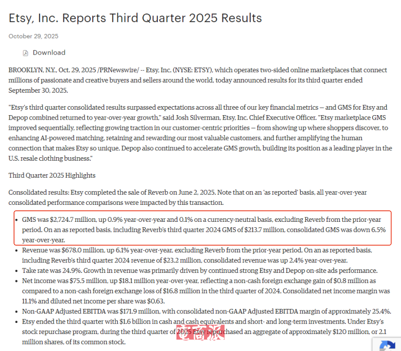 10月30日消息,Etsy公布截至2025年9月30日的第三季度财报。本季度实现营收和净利润双双增长,其中Etsy和Depop合并的商品交易总额(GMS)达27.25亿美元,同比增长0.9%(若排除已出售的Reverb业务,按固定汇率计算增长0.1%。若包含Reverb,同比下降6.5%);营收为6.78亿美元,剔除Reverb后同比增长6.1%;若包含Reverb去年同期2320万美元的营收,同比上涨2.4%。净利润为7550万美元,同比增长18.1%;合并净利润率为11.1%,摊薄后每股收益0.63美元;调整后EBITDA为1.72亿美元,调整后EBITDA利润率约为25.4%。