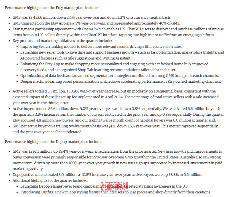 本季度,Etsy及Depop的综合表现强劲,三项关键财务指标均超出预期,Depop在美国转售服装领域持续巩固领先地位。Etsy平台的顺序性改善也体现了公司在AI驱动匹配、用户留存与个性化体验等战略方向上的执行成效。Etsy和Depop的优异表现推动合并GMS超出预计区间上限。Etsy平台的调整后EBITDA利润率接近30%,Depop因加大品牌投入导致利润率环比下降,但这一投资将进一步扩大其在美国的市场机会。