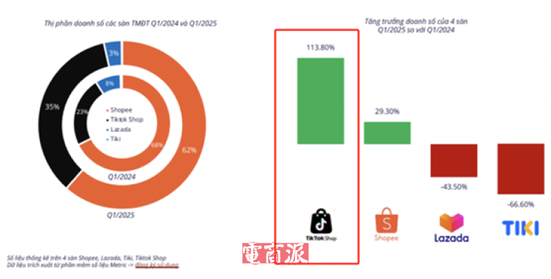 Metric.vn的另一份季度报告就是实证。2025年第一季度,TikTok Shop越南站点的销售额同比增长超110%,所占市场份额也从上一年同期的23%提升至35%。与之相比,Shopee当季度的销售额虽然也增长29.3%,但市场份额却从68%下滑至62%。